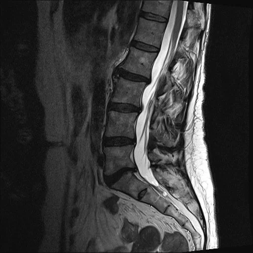 This is a sagittal (side-on) T2 MRI image of a normal lumbar spine in a young adult. As a T2 scan shows water (and fat) as bright, the CSF (spinal fluid) is white as is the nucleus of the disc. The discs themselves show normal height and no bulging meaning that there is minimal degeneration.