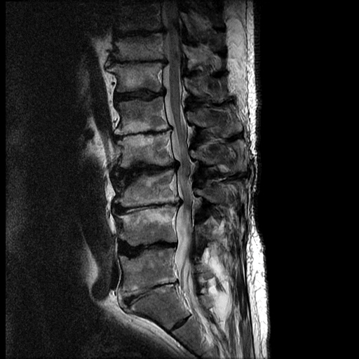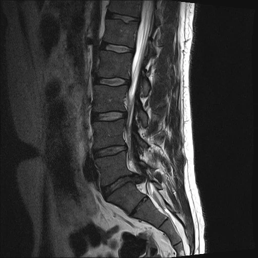 On this scan, there is advanced degeneration of the bottom disc (L5-S1). Compared with the other discs it is very narrow and there is prominent posterior bulging. The bone adjacent to the disc (vertebral endplate) shows increased brightness which is a sign of disc degeneration (Modic changes).